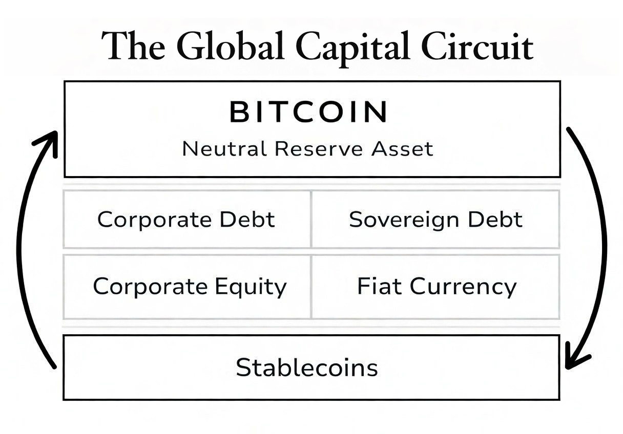 Capital has always operated within a stack of claims. A layered hierarchy where senior obligations enjoy contractual priority and junior layers bear the residual risk. In the digital era, a once more static ladder becomes a high-velocity circuit. Capital can now migrate from sovereign equity to neutral reserves and back again, driven by real-time market discipline. Historically, sovereign discipline relied on external anchors that evolved from a physical limit (gold) to a relative tether (U.S. Treasuries). Bitcoin breaks from this pattern. Its protocol-fixed finite supply operates within a decentralized, permissionless settlement network, creating the first truly digital neutral reserve asset. Bitcoin serves as a true hard cap on the global capital stack immune to alteration by any single authority as an asset without an issuer or superior claim. Market participants frequently dismiss bitcoin as speculation today because they are still calibrating to an asset whose core role is not to supplant fiat currencies, but to serve as the immutable benchmark against which all claims are measured in real time. And at this same moment, digital dollar mechanisms like stablecoins extend fiat liquidity into programmable, borderless networks, enabling participation in sovereign currency systems while maintaining a seamless, neutral exit into bitcoin. The mere existence of this new circuit fundamentally shifts incentives across the entire system.
